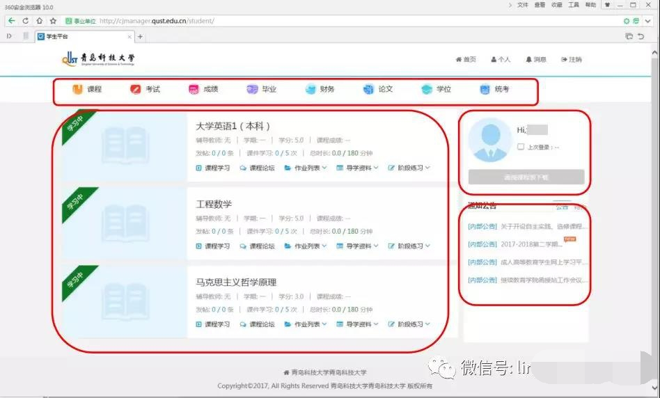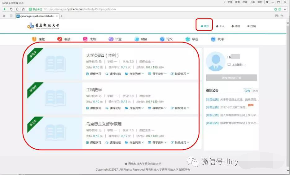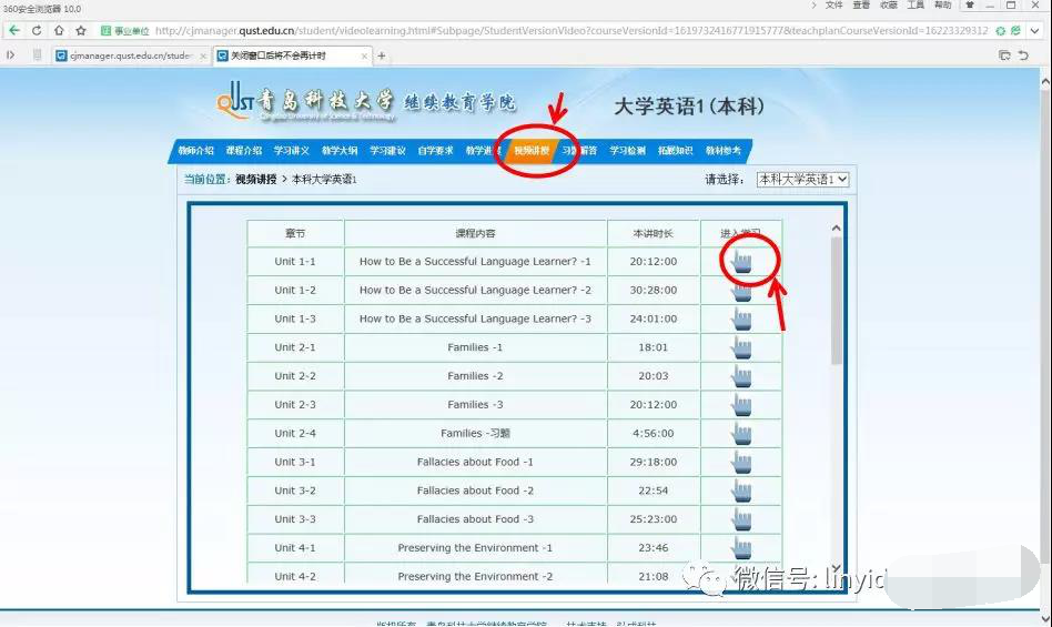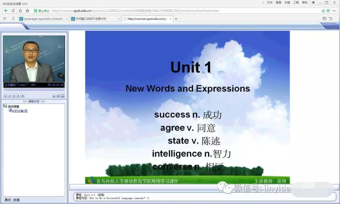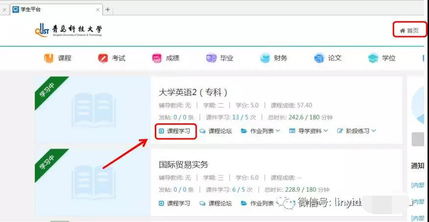 根据青岛科技大学继续教育学院的要求,2018级、2019级学员可以进行网上在线学习了,现在将有关学习事宜通知如下:本学期网上学习平时成绩占20分,每门课学习时长达到180分钟,同时要求每门课要求点击次数达到5次以上。请各位学员在2019年12月20日前登录学习平台完成学习。